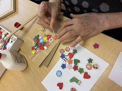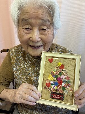 デイサービス11月行事 さつきが丘デイサービスブログ 公開日: 2025年11月29日 デイサービスの11月の行事は「ボタンのクリスマスツリー講座」を行いました。 クリスマス柄やハート、花柄等お好きなボタンを選んで頂きクリスマスツリーの形に指先を使い小さなボタンを1つ1つ貼り付けていく工程です。 ボタンを選ぶ楽しさもあり、自分だけの作品が出来た時の喜びと達成感!うれしそうな笑顔をたくさんみせて頂きました。 今はご自宅に飾っていただいているようです。メリークリスマス!